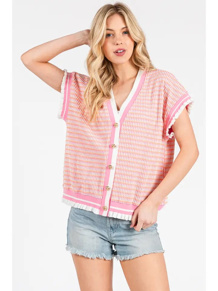 Striped Button-Front Collared Pullover – Taupe/Cream
